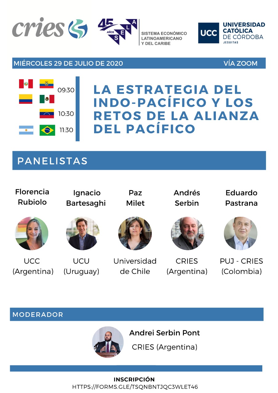 오는 7 월 29 일 오전 10시 30 분(카라카스) 경제사회연구지역조정관(CRIES)이 웹 세미나 "인도-태평양 전략과 태평양 동맹의 도전"을 개최한다. 라틴아메리카경제기구(SELA)의 상임 서기 및 대사 Javier Paulinich가 참석할 예정이다. 무료 접수: https://forms.gle/tSqnbntjQc3WLET46