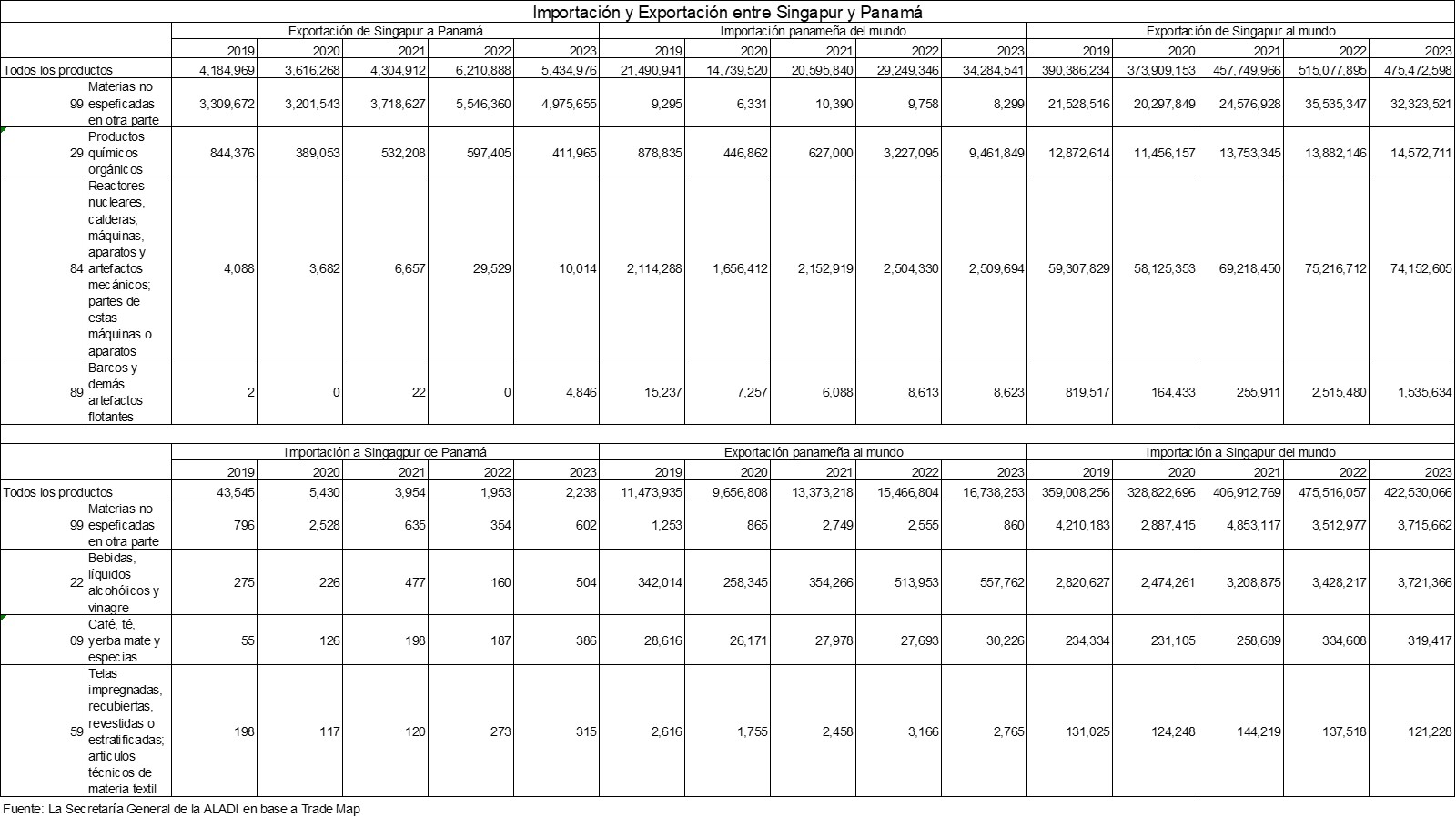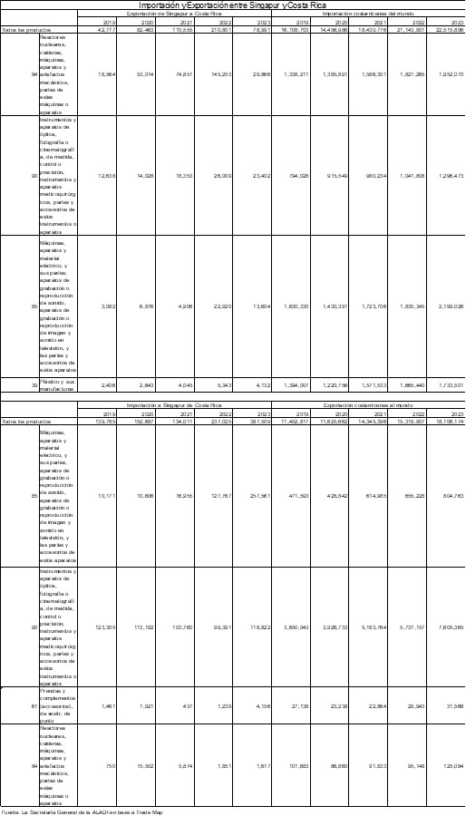 En el año 2023, Singapur exportó a Panamá y Costa Rica 5,435 millones de dólares y 79 millones de dólares, respectivamente, e importó 2,238 millones de dólares y 388 millones de dólares, respectivamente. Consulta la gráfica y la tabla abajo para más detalles.